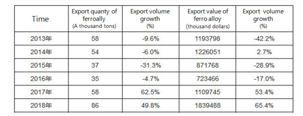 一、近兩年來,由于中國的資源優勢和政策支持,鐵合金出口前景良好。這是2013年至2018年鐵合金出口的統計表。